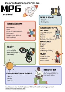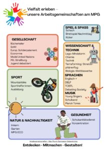 Am Max-Planck-Gymnasium bieten wir eine vielfältige Auswahl an außerschulischen Aktivitäten, die das Lernen ergänzen und die persönliche Entwicklung unserer Lernenden fördern. Unsere Lehrkräfte und engagierte Eltern leiten verschiedene Arbeitsgemeinschaften in musischen, sprachlichen, naturwissenschaftlichen und sportlichen Bereichen außerhalb des regulären Unterrichts.