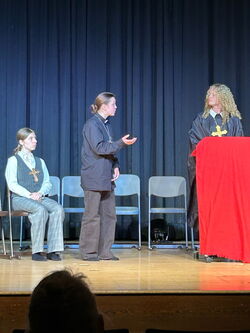 In dieser Woche brachte die englischsprachige Theater-AG „Alternative Drama Highlights“ das Stück „The Crucible“ (Hexenjagd) auf die Bühne unserer Aula. Die AG besteht aus Schülerinnen und Schülern aller drei Bueraner Gymnasien und wird von Michael Scharnowski (Leibniz Gymnasium) seit vielen Jahren geleitet. Das Stück von Arthur Miller spielt im 17. Jahrhundert und dreht sich um Magie, Macht und die Frage, wie weit man gehen darf, um seine eigene Haut zu retten, indem man andere beschuldigt. Vom MPG spielte in diesem Jahr Charlotte Schneider aus der Jahrgangsstufe EF bei der großartigen Inszenierung mit.