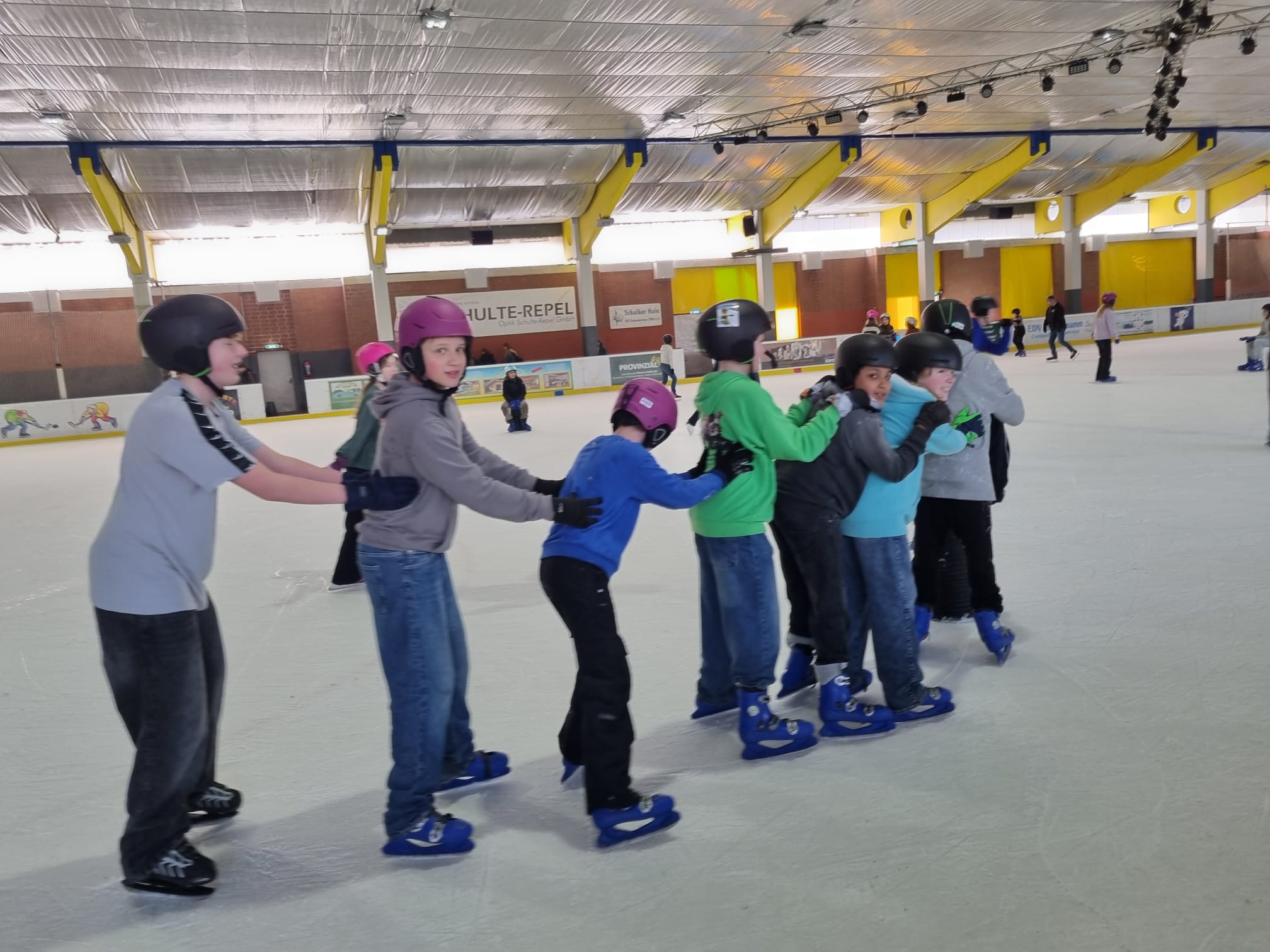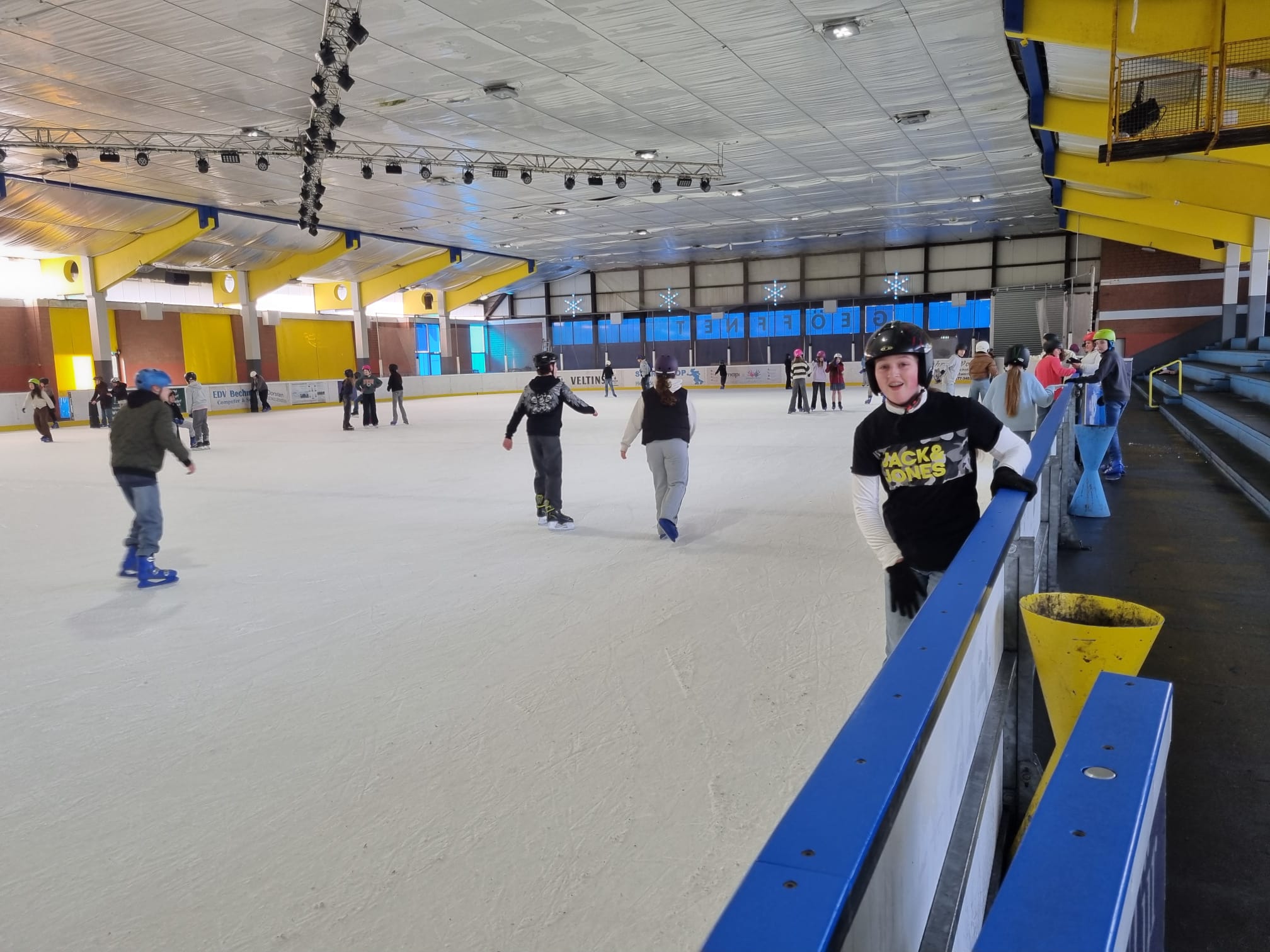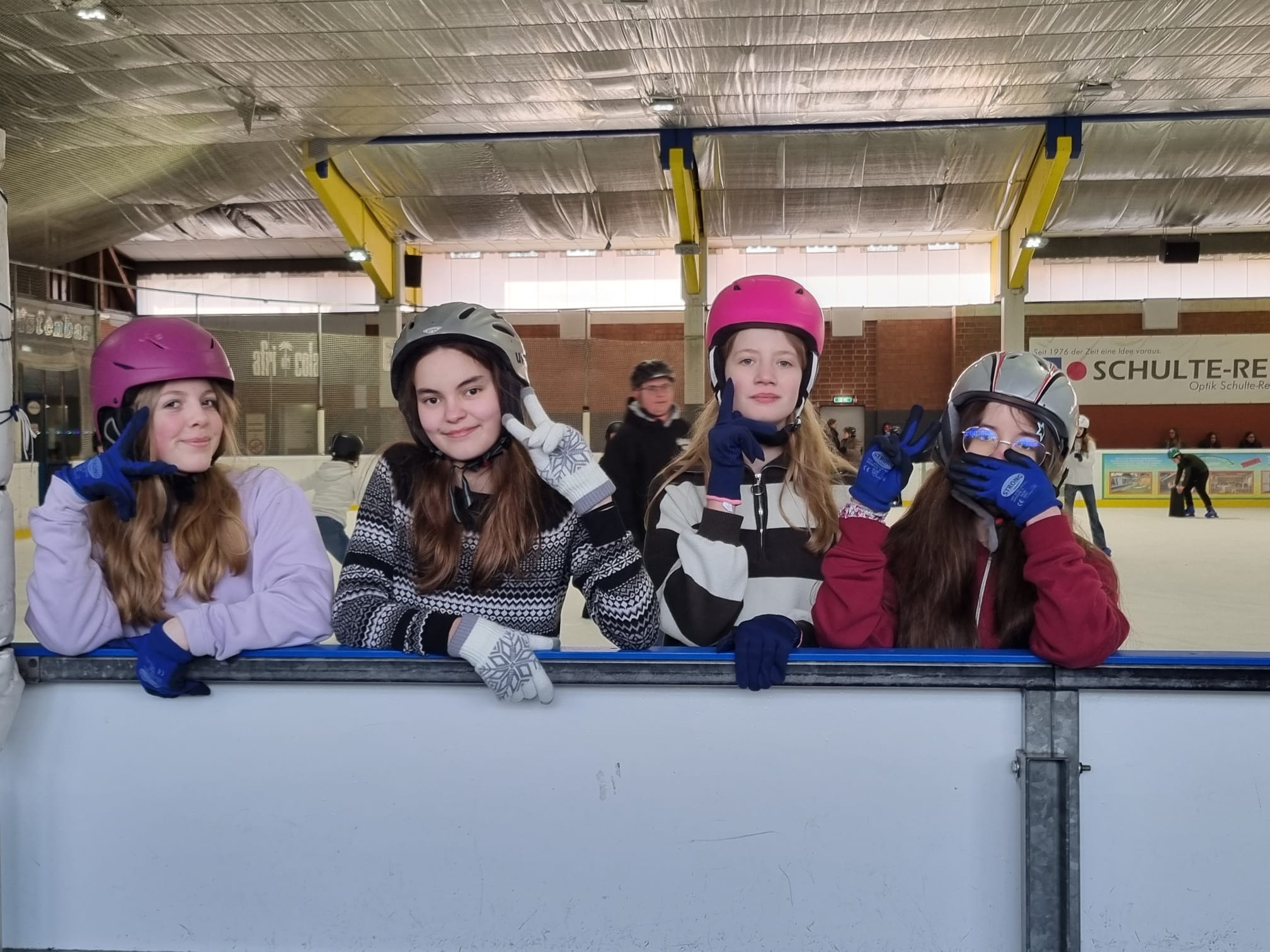 Am 26.02.2026 machten die Klassen 7b und 7d einen Ausflug in die Eissporthalle nach Dorsten. Hierzu trafen sich die Schülerinnen und Schüler am Morgen an der Schule, um mit den Klassenlehrkräften die Fahrt nach Dorsten anzutreten. Nach der Ankunft an der Eishalle wurden alle Teilnehmenden mit Schlittschuhen versorgt, woraufhin alle voller Elan auf das Eis gingen. Die Schülerinnen und Schüler hatten ausreichend viel Platz in der großen Halle, um sich im Gleiten und Skaten auszuprobieren. Schon nach einiger Zeit fingen die ersten an, ihre künstlerischen Fähigkeiten auf dem Eis vorzuführen. Man konnte sehen, wie Pirouetten gedreht wurden und wie alles als Hindernis genutzt wurde (beispielsweise Fahrhilfen in Form von Tonnen). Als Stärkung oder zum Aufwärmen konnten die Kinder sich etwas Warmes beim Kiosk holen, wie zum Beispiel eine heiße Schokolade oder Pommes. Es war nicht nur eine sportliche Herausforderung, sondern auch ein tolles Erlebnis für die Klassengemeinschaft.