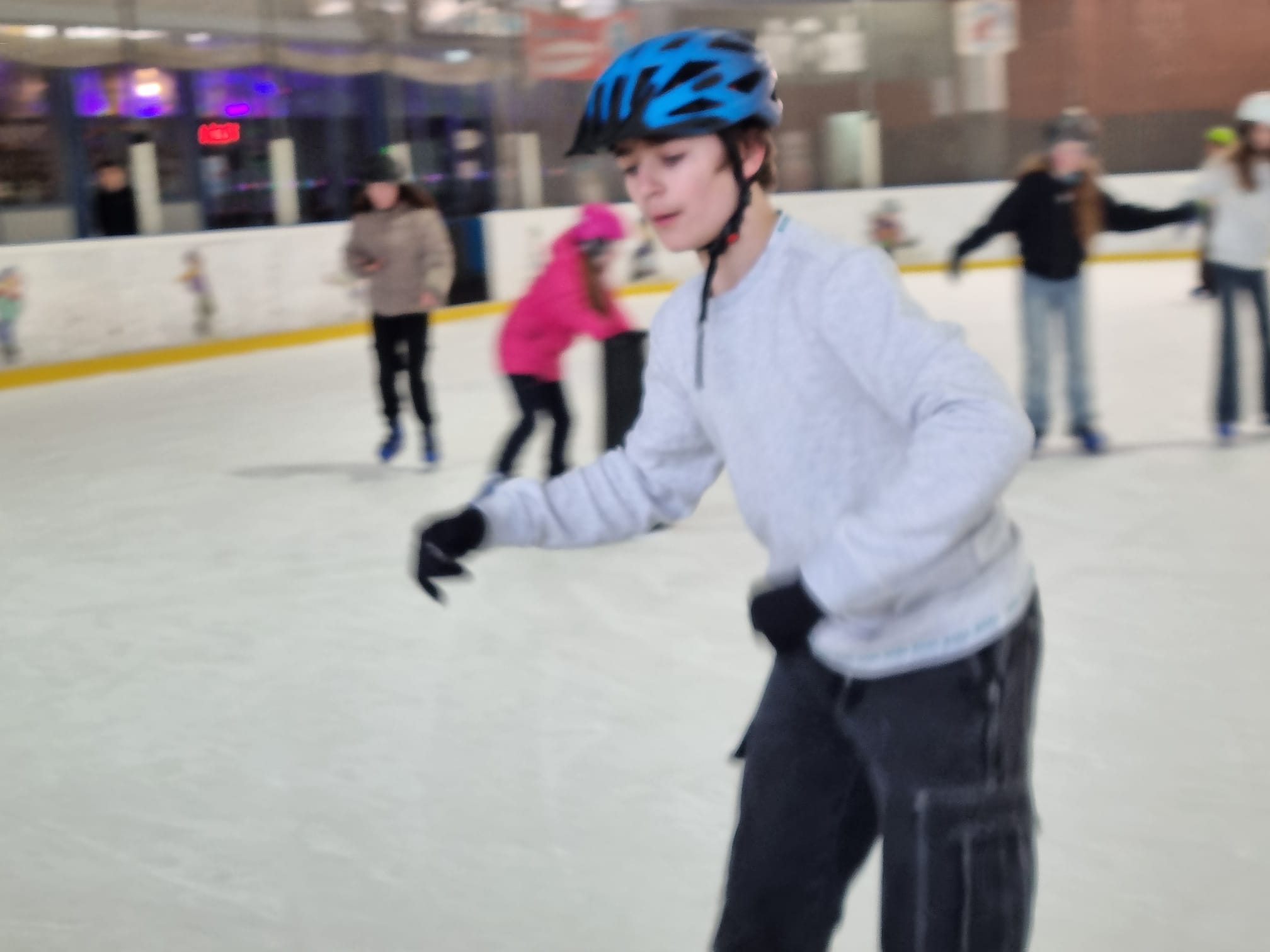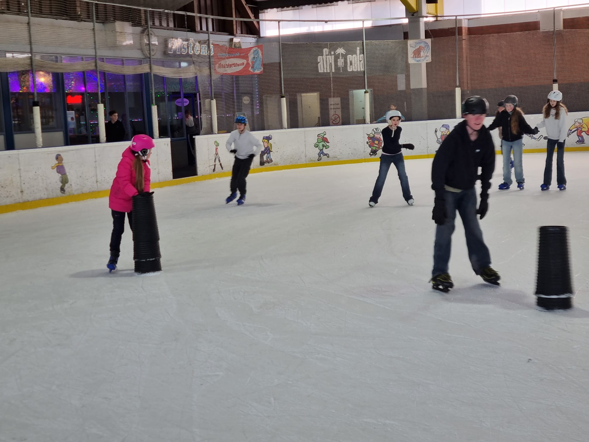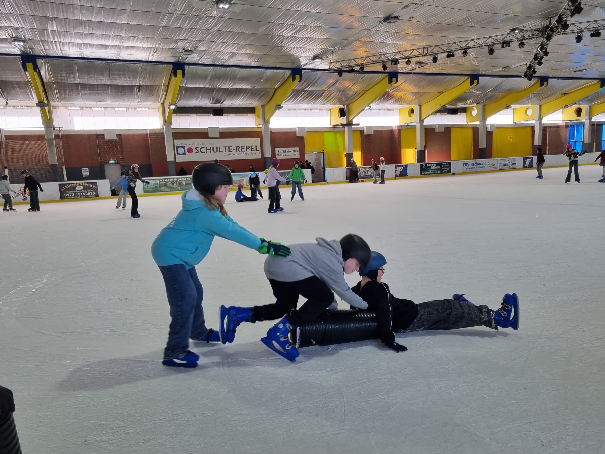 Am 26.02.2026 machten die Klassen 7b und 7d einen Ausflug in die Eissporthalle nach Dorsten. Hierzu trafen sich die Schülerinnen und Schüler am Morgen an der Schule, um mit den Klassenlehrkräften die Fahrt nach Dorsten anzutreten. Nach der Ankunft an der Eishalle wurden alle Teilnehmenden mit Schlittschuhen versorgt, woraufhin alle voller Elan auf das Eis gingen. Die Schülerinnen und Schüler hatten ausreichend viel Platz in der großen Halle, um sich im Gleiten und Skaten auszuprobieren. Schon nach einiger Zeit fingen die ersten an, ihre künstlerischen Fähigkeiten auf dem Eis vorzuführen. Man konnte sehen, wie Pirouetten gedreht wurden und wie alles als Hindernis genutzt wurde (beispielsweise Fahrhilfen in Form von Tonnen). Als Stärkung oder zum Aufwärmen konnten die Kinder sich etwas Warmes beim Kiosk holen, wie zum Beispiel eine heiße Schokolade oder Pommes. Es war nicht nur eine sportliche Herausforderung, sondern auch ein tolles Erlebnis für die Klassengemeinschaft.