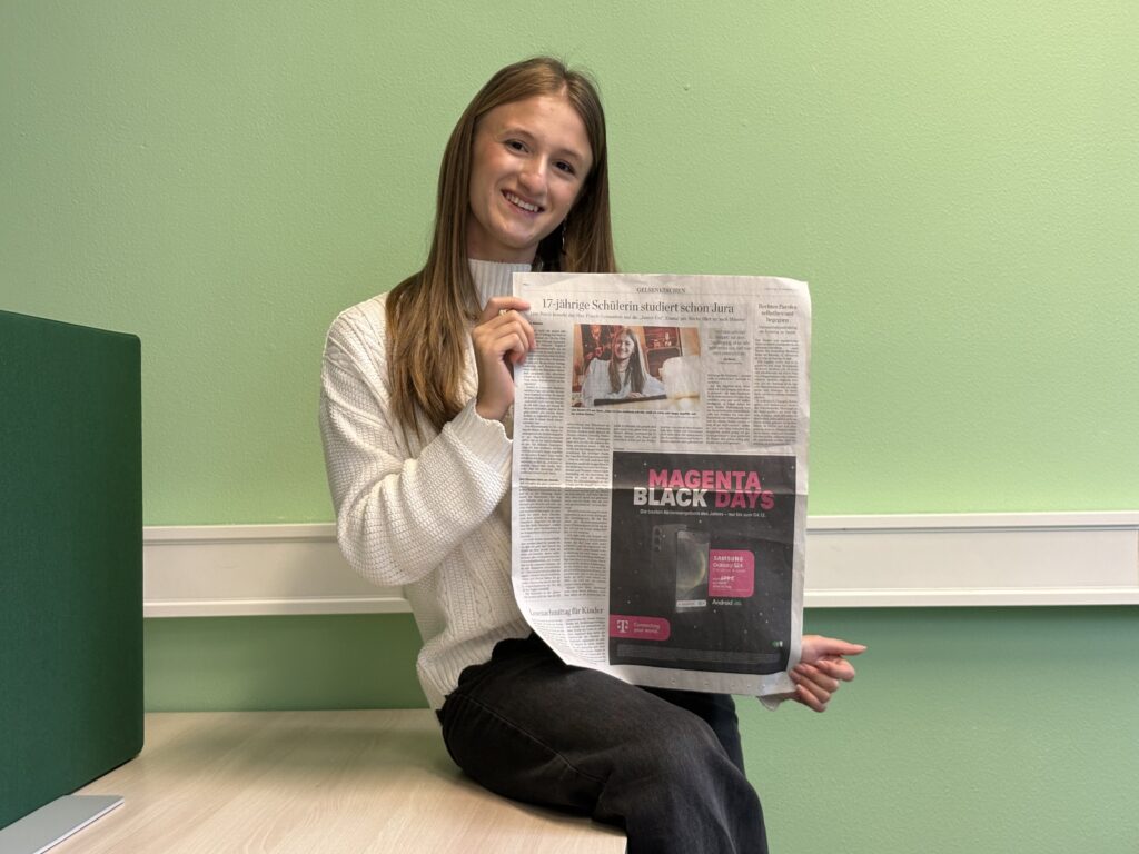 Lina Busch aus der Jahrgangsstufe Q1 studiert im Rahmen des „Junior-Uni“-Projekts neben der Schule Rechtswissenschaften an der Universität Münster. Bereits seit der Jahrgangsstufe EF nimmt Lina an den Vorlesungen der juristischen Fakultät teil. In einem großen Interview mit Annika Matheis von der WAZ berichtet sie von ihren Erfahrungen und ihrer Motivation, ein solches Studium parallel zum Unterricht am MPG durchzuführen. Der ausführliche Artikel erschien am 20.11.25 in der WAZ.