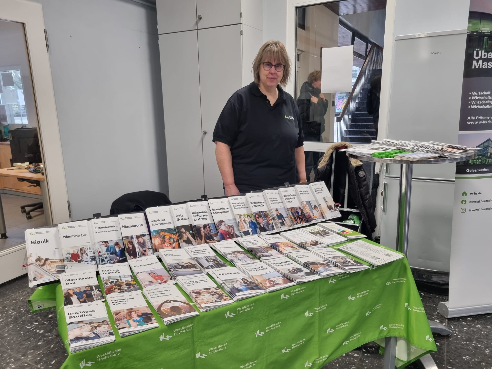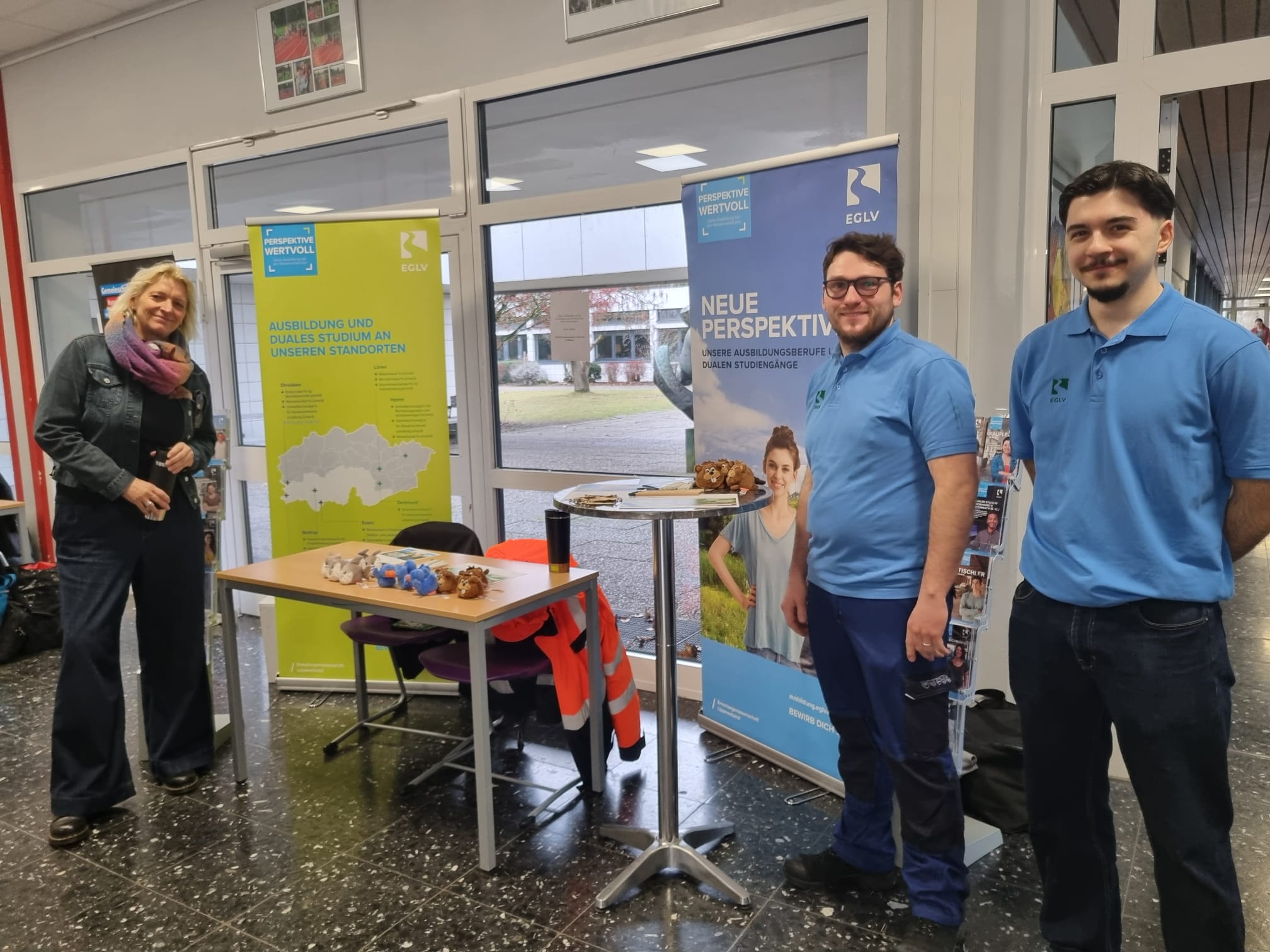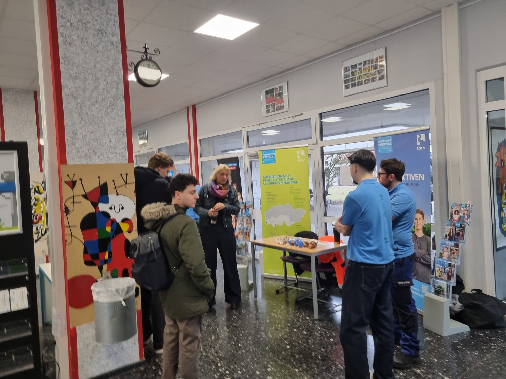 Darüber hinaus waren die Schülerinnen und Schüler dazu eingeladen, sich an Informationsständen weitere Informationen zu beschaffen und mit den jeweiligen Ansprechpartnerinnen und Ansprechpartnern vertieft ins Gespräch zu kommen. Die in der Pausenhalle und in der Cafeteria aufgebauten Stände erweiterten das Informationsspektrum noch um zusätzliche Sparten aus diversen Berufsfeldern wie etwa Pflege, Vermessungstechnik, Fachinformatik, Speditions- und Logistikdienstleistungen, Logistikmanagement und Sozialversicherungsrecht. Komplettiert wurde das umfassende Forum aus Expertinnen und Experten von der Zentralen Studienberatung der Westfälischen Hochschule und von Claudia Liersch (Bundesagentur für Arbeit), die als Berufsberaterin bereits seit vielen Jahren unsere Schülerinnen und Schüler mit hoher Kompetenz und großem Engagement im Berufsorientierungsprozess begleitet. Die Mischung aus Vortragsveranstaltungen und Informationsständen ermöglichte wieder einen vielfältigen Austausch, von dem die Schülerinnen und Schüler sowie die Vertreterinnen und Vertreter der Unternehmen und Institutionen gleichermaßen profitierten. Die Schülerinnen und Schüler wurden umfangreich informiert und konnten bei Bedarf die Chance ergreifen, gezielte Einzelgespräche zu führen, um individuelle und spezifische Fragen zu klären. Die Expertinnen und Experten konnten im Umkehrschluss die Plattform nutzen, um „unmittelbar an der Basis“ ihre Erwartungen hinsichtlich zukünftiger Bewerberinnen und Bewerber transparent zu machen.