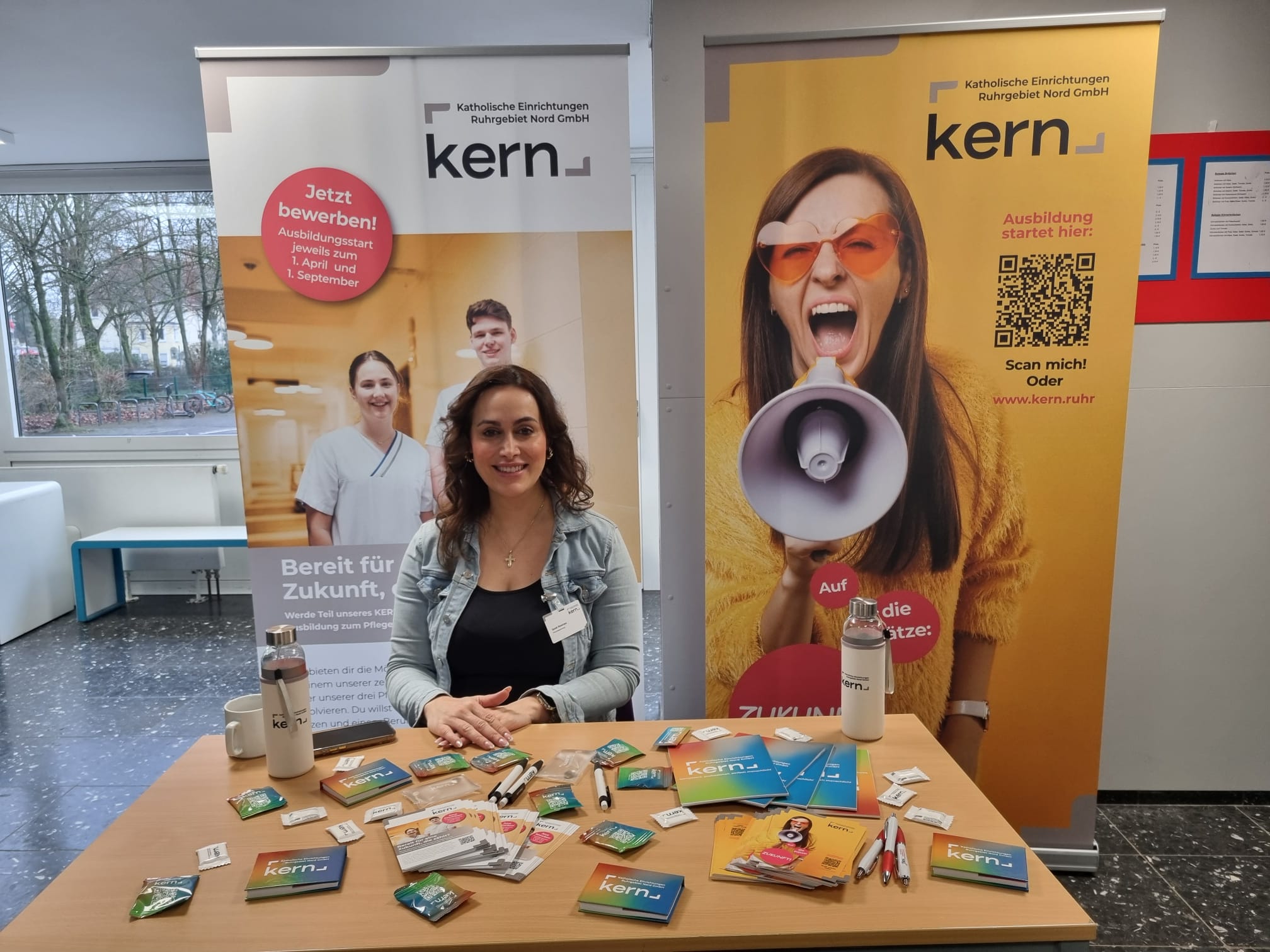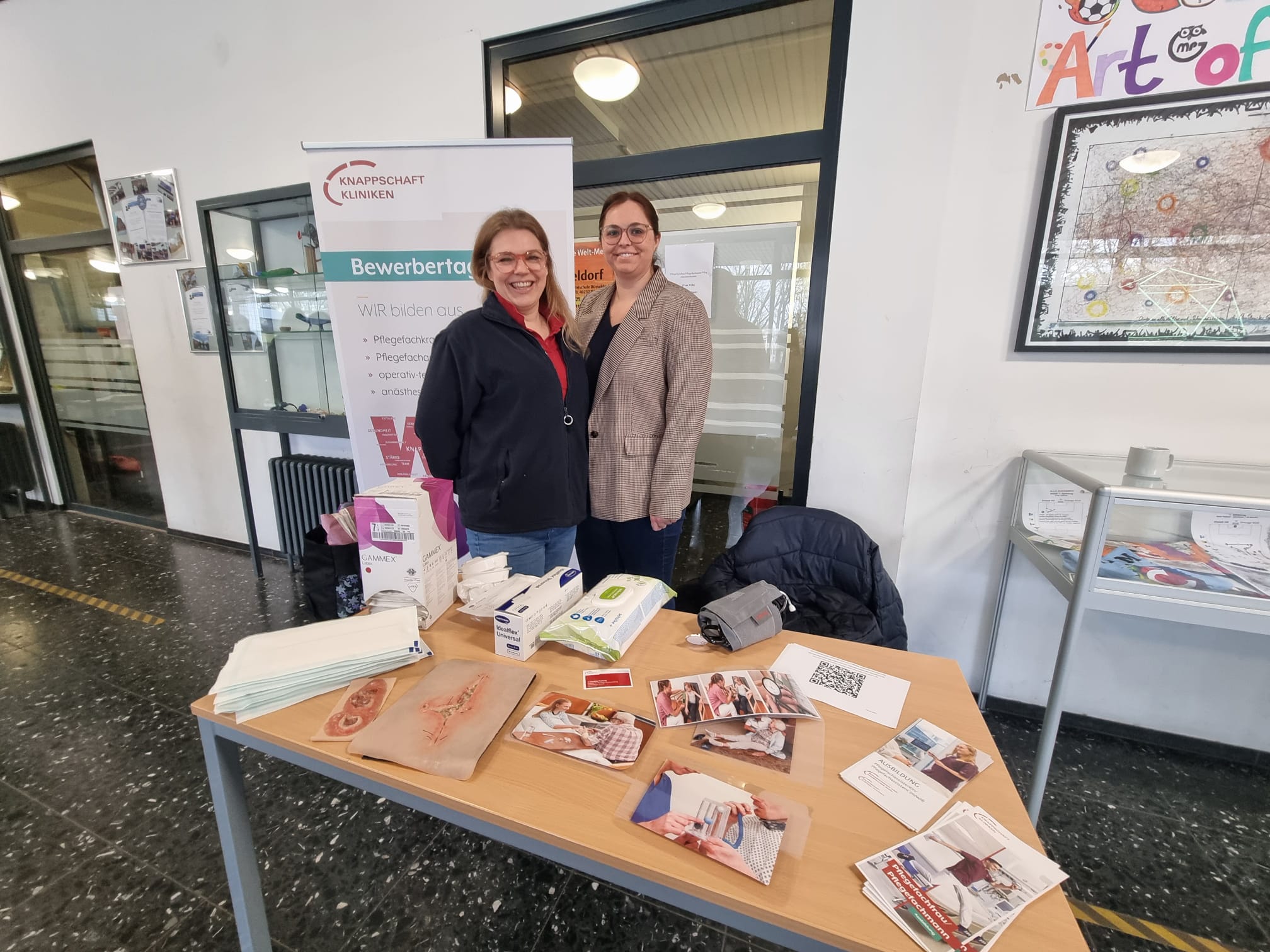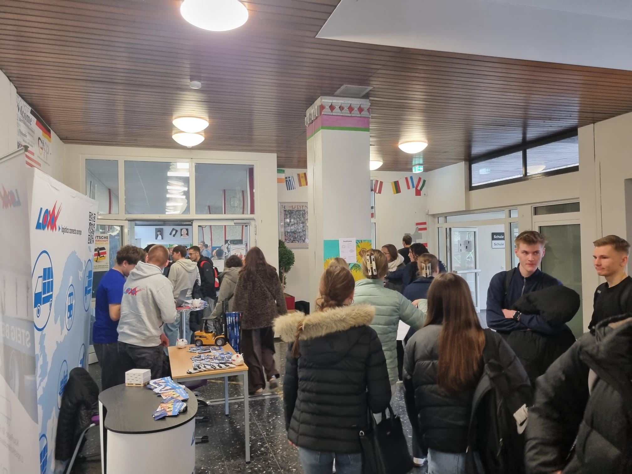Darüber hinaus waren die Schülerinnen und Schüler dazu eingeladen, sich an Informationsständen weitere Informationen zu beschaffen und mit den jeweiligen Ansprechpartnerinnen und Ansprechpartnern vertieft ins Gespräch zu kommen. Die in der Pausenhalle und in der Cafeteria aufgebauten Stände erweiterten das Informationsspektrum noch um zusätzliche Sparten aus diversen Berufsfeldern wie etwa Pflege, Vermessungstechnik, Fachinformatik, Speditions- und Logistikdienstleistungen, Logistikmanagement und Sozialversicherungsrecht. Komplettiert wurde das umfassende Forum aus Expertinnen und Experten von der Zentralen Studienberatung der Westfälischen Hochschule und von Claudia Liersch (Bundesagentur für Arbeit), die als Berufsberaterin bereits seit vielen Jahren unsere Schülerinnen und Schüler mit hoher Kompetenz und großem Engagement im Berufsorientierungsprozess begleitet. Die Mischung aus Vortragsveranstaltungen und Informationsständen ermöglichte wieder einen vielfältigen Austausch, von dem die Schülerinnen und Schüler sowie die Vertreterinnen und Vertreter der Unternehmen und Institutionen gleichermaßen profitierten. Die Schülerinnen und Schüler wurden umfangreich informiert und konnten bei Bedarf die Chance ergreifen, gezielte Einzelgespräche zu führen, um individuelle und spezifische Fragen zu klären. Die Expertinnen und Experten konnten im Umkehrschluss die Plattform nutzen, um „unmittelbar an der Basis“ ihre Erwartungen hinsichtlich zukünftiger Bewerberinnen und Bewerber transparent zu machen.
