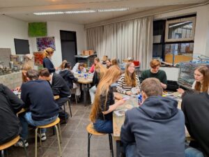 Der Tag startete mit einem herzlichen Empfang, der von Johanna Neumann und Johannes d’ Anterroches (beide Q1) moderiert wurde. Auch Schulleiterin Cirsten Scharf und unser stellvertretender Schulleiter Marcus Feldhaus begrüßten unsere Gäste und freuten sich über einen Strauß Tulpen und eine Fahne unserer Partnerschule. Es folgte ein gemeinsames Frühstück in der Schule und anschließend besuchten die niederländischen und deutschen Schüler:innen (alle Abitur 2025) in Teams den Unterricht in der Jahrgangsstufe Q1. Die Hilversumer:innen hatten dabei ihren ganz persönlichen „Buddy“, so dass schnell Kontakte geknüpft wurden.