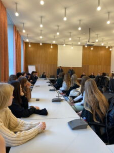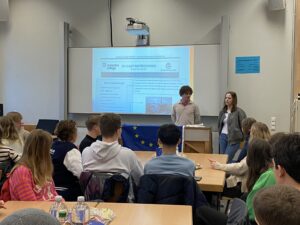 Der Tag startete mit einem herzlichen Empfang, der von Johanna Neumann und Johannes d’ Anterroches (beide Q1) moderiert wurde. Auch Schulleiterin Cirsten Scharf und unser stellvertretender Schulleiter Marcus Feldhaus begrüßten unsere Gäste und freuten sich über einen Strauß Tulpen und eine Fahne unserer Partnerschule. Es folgte ein gemeinsames Frühstück in der Schule und anschließend besuchten die niederländischen und deutschen Schüler:innen (alle Abitur 2025) in Teams den Unterricht in der Jahrgangsstufe Q1. Die Hilversumer:innen hatten dabei ihren ganz persönlichen „Buddy“, so dass schnell Kontakte geknüpft wurden.