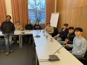 Am Nachmittag stand ein buntes Programm für die Gruppe von rund 50 Schüler:innen und 4 Lehrkräften beider Schulen an, das mit dem Empfang im Rathaus Buer begann. Obwohl Bezirksbürgermeister Dominic Schneider, wie üblich an Weiberfastnacht, sein Rathaus vor der Übernahme der Jecken beschützen musste, nahm er sich die Zeit, um unsere Delegation persönlich zu begrüßen, wofür wir uns herzlich bedanken. Abwechselnd konnte je eine Hälfte der Gruppe bei Kaffee und Kuchen in den Austausch kommen oder den Rathausturm besteigen, um den Ausblick über Buer zu genießen.