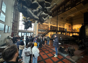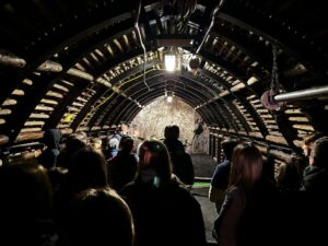 Und getreu dem Motto „never change a running system“ stand am 4. Dezember der zweite Ausflug an. Wurde sich noch am ersten Tag mit der Zeit nach dem Strukturwandel beschäftigt, stand dieses Mal die Zeit vor dem Wandel im Fokus: es ging ins Bergwerkmuseum in Bochum. Vor dem Museum erzählte uns Olivier Kruschinski etwas über das Ruhrgebiet zur Zeit der Kohleförderung. Nach einer 60-minütigen Führung konnten die Schüler in Kleingruppen das Museum erkunden. Als unsere Schüler dann auch erfuhren, dass anfangs die Kohle mithilfe von knochenharter und stundenlanger Kinderarbeit gefördert wurde, erhielten sie die Erkenntnis des Tages: „Ach, Schule ist ja doch nicht so übel!“