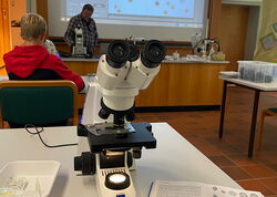 Den zweiten Tag im Naturschutzgebiet verbrachten wir mit der Kontrolle von Fledermauskästen, bei der wir tatsächlich fünf Zwergfledermäuse entdecken konnten, und dem Fällen von invasiven Baumarten wie der amerikanischen Traubenkirsche. Dabei besuchte uns zudem ein Lehrer dreier Teilnehmender, der uns bei unserer Aufgabe half. Wir errichteten Fledermaus-Detektoren in der Hoffnung, einige Aufnahmen zu bekommen. Anschließend sammelten Herr Trapmann und der dazu gekommene Lehrer Planktonproben aus dem Heiligen Meer, die wir, zurück in der Forschungsstätte, mit Mikroskopen untersuchten. Nach dem Abendbrot errichteten wir Fangnetze, die wir die folgenden drei Stunden abwechselnd bewachten. Leider konnten wir in dieser Nacht aber keine Fledermäuse fangen. Als kleinen Trost unternahmen wir mit Herrn Trapmann eine kurze Wanderung zur Sternenbeobachtung.