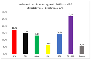 Die Juniorwahl ist ein Schulprojekt zur politischen Bildung, welches seit vielen Jahren auch am MPG stattfindet. Es beinhaltet die unterrichtliche Vorbereitung mit abschließender Wahl und Auswertung. Die Juniorwahl zur Bundestagswahl 2025 steht unter der Schirmherrschaft von Bundespräsident Frank-Walter Steinmeier und wird bundesweit an 4500 Schulen durchgeführt.