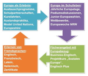 Das Europaprofil am MPG setzt sich aus verschiedenen Bausteinen zusammen. Zusammen bilden sie die Schwerpunkte zur Verwirklichung des europäischen Gedankens an unserer Schule.