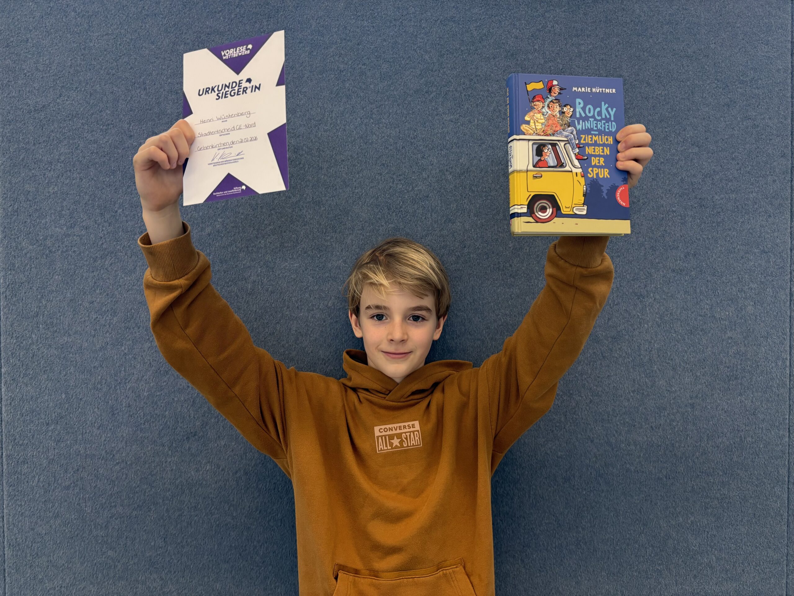 Seit über 60 Jahren gibt es den Vorlesewettbewerb des Deutschen Buchhandels und gut 600.000 Kinder beteiligen sich insgesamt an den schulischen Wettbewerben. Die Gewinner treten nach den Schulentscheiden auf Stadtebene gegeneinander an. Sieger beim Stadtentscheid im Gelsenkirchener Norden ist am 21.02.26 unser Schüler Henri Wüstenberg aus der Klasse 6c geworden. Er fährt nun zum Regionalentscheid und kann dort seine Lesefähigkeit erneut unter Beweis stellen. Herzlichen Glückwunsch zu diesem Erfolg und alles Gute für die nächste Runde