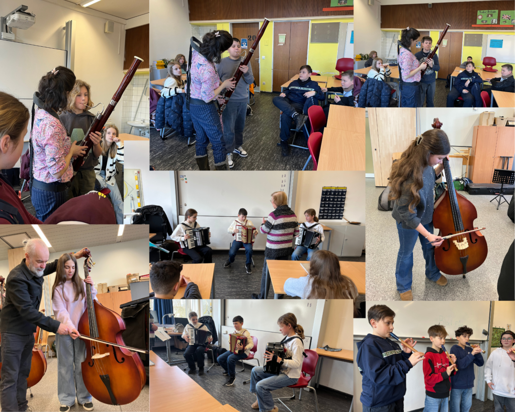 Beim diesjährigen Instrumentenkarussell stand für die Schülerinnen und Schüler des 6. Jahrgangs alles im Zeichen des Ausprobierens und Kennenlernens von unterschiedlichen Musikinstrumenten. Die Auswahl war groß: Von Blockflöte, Fagott, Klarinette, Akkordeon und Kontrabass war alles vertreten. Begleitet wurde der Tag von engagierten Instrumentallehrkräften der Städtischen Musikschule Gelsenkirchen, mit der das MPG seit Oktober 2025 eine Kooperation mit dem Namen „MPG-Dreiklang“ pflegt. Mit Geduld und Begeisterung gaben die Lehrkräfte den Kindern Einblicke in die Welt des Musizierens und machten Lust auf mehr. Das Interesse war groß und viele Schülerinnen und Schüler zeigten Freude am Ausprobieren und könnten sich gut vorstellen nun selbst ein Instrument zu erlernen.