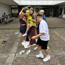 In der vergangenen Schulwoche führte der gesamte 7. Jahrgang das Trainingsprogramm „Meistere dein Kopfkino“ durch. Jeweils einen ganzen Schultag übten die Klassen den konstruktiven Umgang mit Mobbing- und Konfliktsituationen. Es ging zudem um positives Denken, den respektvollen Umgang miteinander und um Selbstvertrauen in das eigene Handeln. Unsere Schülerinnen und Schüler waren mit vollem Eifer bei der Sache. Unter anderem mussten sie versuchen, eine Decke umzudrehen, ohne dass jemand den Boden berührt und einen Zollstock auf den Zeigefingern zu balancieren. Durchgeführt wurde die Veranstaltung von Frau Birgit Busse, Gründerin von „Die Stärkenakademie“.