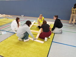 Die Brücke wurde einst vom Universalgenie Leonardo da Vinci (1452-1519) entworfen und war so stabil, dass selbst schwere Wagen über die Konstruktion gezogen werden konnten. Jede Klasse stellte fünf Teams und die Schülerinnen und Schüler lernten beim Aufbau die besondere Bedeutung von Teamwork und Zusammenarbeit. Sie mussten sich selber organisieren, Vorschläge diskutieren und Arbeiten aufteilen. Gleichzeitig erfuhren sie, wie ineinander verschränkte Holzbalken eine hohe Last tragen können, ohne dass irgendwelche Hilfsmittel zur Verbindung der Bauteile genutzt werden.