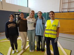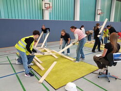 Aus Holzbohlen eine stabile Brücke bauen, obwohl weder Schrauben noch Nägel oder anderes Werkzeug zur Verfügung stehen? Am 10.10.24 bauten die Schülerinnen und Schüler des 8. Jahrgangs im Rahmen eines Wettbewerbs eine „Leonardo-Brücke“. Der Wettbewerb wurde ausgerichtet von der Ingenieurkammer-Bau NRW und soll Interesse wecken an MINT, insbesondere an Ingenieurberufen und Technik.