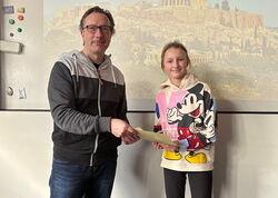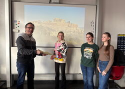 Zwei Gruppen von Schülerinnen des MPG nahmen an dem diesjährigen Landeswettbewerb Aus der Welt der Griechen teil. Innerhalb des MPG konnten sich Lotte Böcker und Emilia Rutkowski (8c) mit einem Hörspiel zu Ungeheuern aus der griechischen Mythologie durchsetzen; Lara Kuczenski, Ciara Schierle und Delia Uzunel (8b) hatten ein Memoryspiel zu antiken griechischen Tempeln entwickelt. Neben Urkunden wurde jeder Gruppe von dem sie betreuenden Lehrer Dr. Penzel ein Siegespreis überreicht.