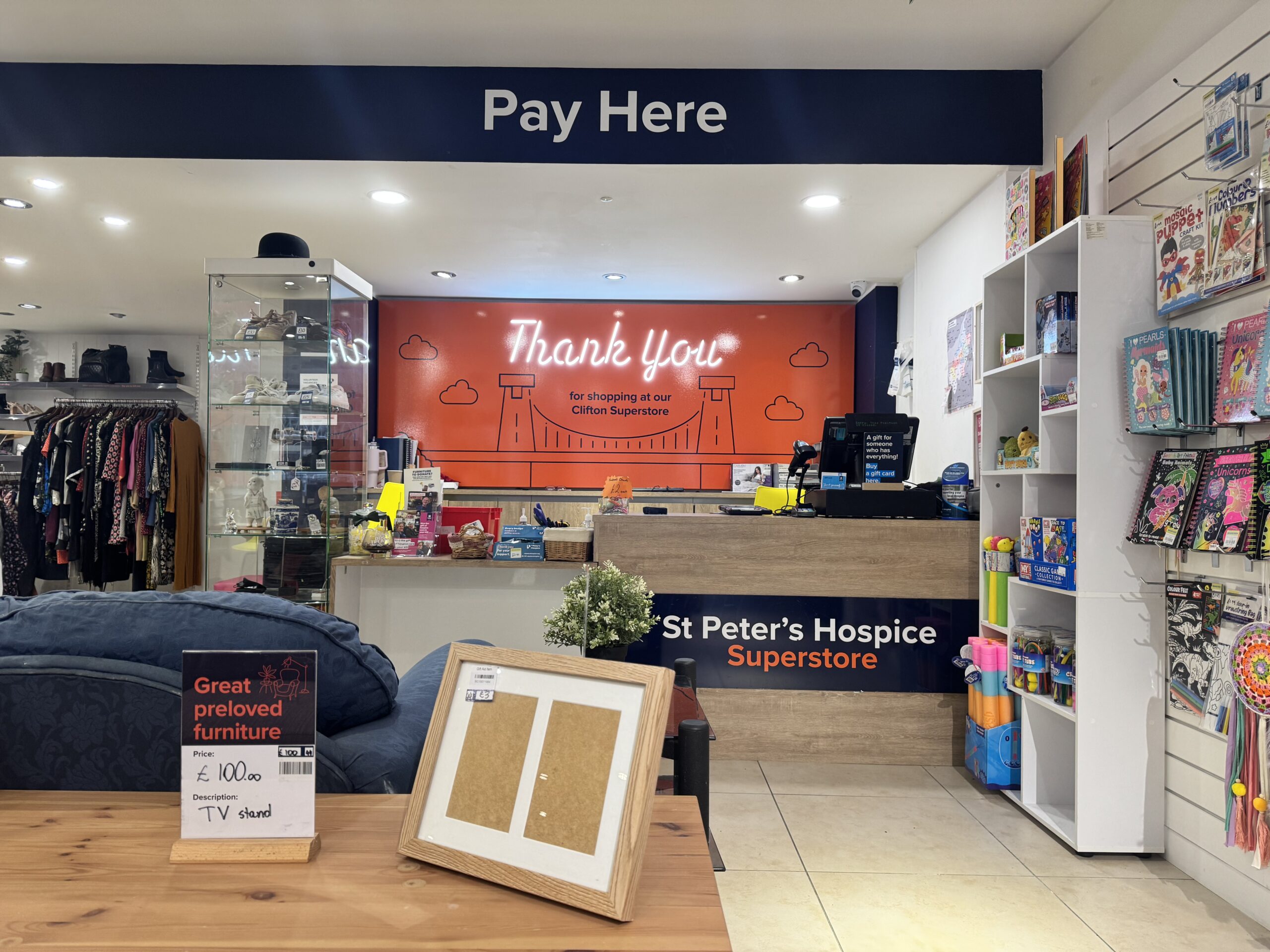 Die St. Peter’s Hospice Shops arbeiten nach einem einfachen Konzept, Menschen aus der Umgebung können Kleidung, Deko, Möbel und auch elektronische Geräte spenden, die dann sortiert und verkauft werden. Die Erlöse gehen zu den St. Peter’s Hospices, wo vor allem Kinder ihre letzten Momente verbringen.