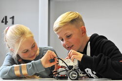 Unterrichts. In Kleingruppen erarbeiten die Lernenden zum Beispiel unterschiedliche Möglichkeiten für den Antrieb von Fahrzeugen. Sie entwerfen und bauen selbständig kleine Fahrzeuge, anhand derer sie Vor- und Nachteile der einzelnen Antriebsarten beurteilen. In einem weiteren Projekt planen und bauen die Lernenden ein Energiesparhaus und untersuchen dieses mit moderner Messtechnik (Wärmebildkamera). Außerdem erhalten die Lernenden eine Einführung in den Bau sowie das Programmieren von Lego Mindstorms Robotern und bewältigen dann Missionen mit ihrem Roboter.