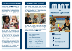 Hinweis: Für euch, liebe Lernende der vierten Klassen, haben wir einen Flyer zusammengestellt, der euch unserer Angebot der MINT-Klasse etwas genauer vorstellt. Ihr könnt ihn auch am MINT-Informationstag oder am Tag der offenen Tür mitnehmen. Zu beiden Terminen laden wir euch zum Ausprobieren und Entdecken herzlich ein, während eure Eltern sich informieren lassen können. Außerdem findet ihr hier eine kleine Präsentation zu unserem MINT-Profil.