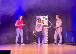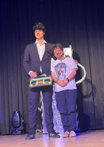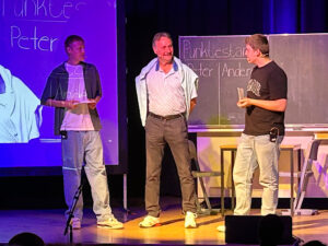 Sport stand nach der großen Pause auf dem Stundenplan, während eines Aerobictrainings mit Mattis Urbanke sollte sich Peter Neururer Gegenstände merken, die parallel zu seiner Turnstunde halb verdeckt über die Bühne getragen wurden, um unter Beweis zu stellen, dass ihm auch heimlich stattfindende Aktionen wie Spicken während einer Klausur nicht verborgen bleiben würden. Es zeigte sich eine beeindruckende Fitness, aber über die „Aufmerksamkeit“ ihres zukünftigen Lehrers, was das Schummeln angeht, dürften sich wohl vorzugsweise die Schüler:innen freuen. Kunst war dann die letzte Disziplin, in der Peter Neururer seine Kompetenz unter Beweis stellen musste. Mit verbundenen Augen im Wettstreit gegen Ben drei Gegenstände zeichnen, wobei die Zuschauer im Hinblick auf die Qualität zensieren, das war wiederum keine leicht zu bewältigende Aufgabe. Vergleichsweise pessimistisch ging Peter Neururer ans Werk: „Bevor ich hier ans Max-Planck gekommen bin, war ich ein Siegertyp!“. Schalke-Logo, BVB-Logo und ein Bierglas, mit einem Unentschieden konnten beide Kontrahenten zunächst gut leben, im entscheidenden „Schnick, Schnack, Schnuck“ setzte sich schließlich dann aber Peter Neururer durch. Das abschließende Pantomimespiel, in dem vom Publikum in Szene gesetzte Begriffe rund um Schule einerseits und Sport andererseits zu erraten waren, konnte Peter Neururer mit 6:4 gegen Noah Bullerkotte aus der Q1 für sich entscheiden.