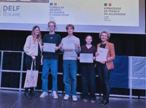 Am 21.11.25 fand in Düsseldorf die feierliche Verleihung der DELF-intégré Diplome statt. Unsere Schule durfte mit den drei besten Schülerinnen und Schülern vertreten sein, die aufgrund herausragender Leistungen im Fach Französisch nach Düsseldorf eingeladen wurden.