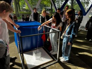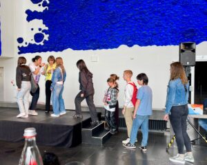Heute war es endlich soweit und die Kunstprojekte unserer Spieler:innen wurden in einer virtuellen Ausstellung der Öffentlichkeit präsentiert. Innerhalb einer Führung im Volumen konnten die Ergebnisse der Kreativ-Workshops von allen Besucher:innen über einen QR-Code abgerufen und hautnah erlebt werden. So bekamen die Schulleitung, die Familien und Freunde der Spieler:innen und auch wir einen guten Einblick in das kreative Arbeiten während der Spielzeit.