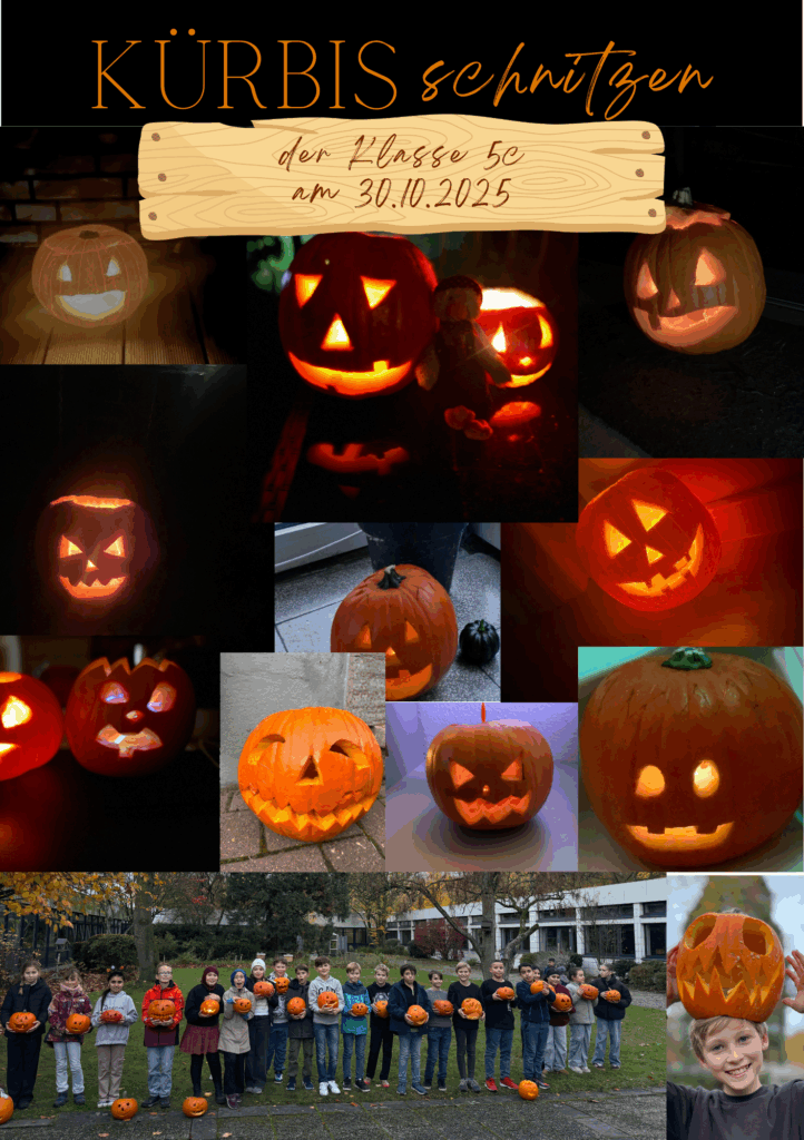 Wenn auf dem Schulhof der vertraute Duft von Herbst in der Luft liegt, dann ist klar: Unser alljährliches Kürbisschnitzen steht wieder vor der Tür! Am 30.10.25 folgten die Schülerinnen und Schüler der Klasse 5c der Einladung der Klassenlehrerinnen, die zu diesem fröhlichen Herbstbrauch einluden. Dabei wurden tolle Gruselgesichter aus den Kürbissen gezaubert und überall wurde gelacht, geschnitzt, geschabt – und natürlich stolz präsentiert, wenn ein gelungener Kürbis fertig war. Wieder einmal zeigte sich: Das gemeinsame Kürbisschnitzen als Klassengemeinschaft ist ein Ereignis, das Lehrkräfte, Eltern und Kinder zusammenbringt – gemütlich, kreativ und einfach rundum herbstlich.