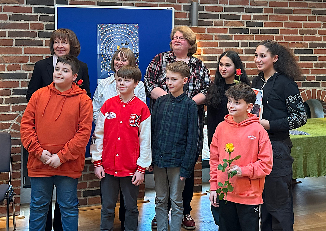 Die Bildungsdezernentin Frau Heselhaus übergab am Ende des sehr spannenden Vorlesewettbewerbs allen Schüler:innen einen Buchpreis sowie eine Urkunde. Dem Sieger, Luke aus der 6b des Annette-von-Droste-Hülshoff-Gymnasiums, verlieh sie abschließend die Siegerurkunde. Für Luke geht es nun weiter in die nächste Runde. Wir wünschen ihm dabei viel Erfolg!